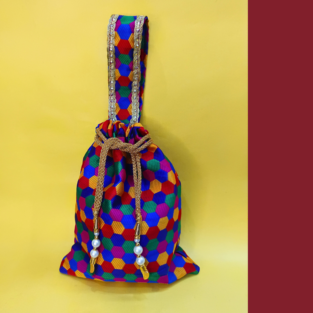 Elevate your festive style with this designer multicolor potli bag crafted in vibrant traditional patterns. Perfectly blending ethnic elegance and modern charm, this potli purse features a premium fabric base with a colorful geometric design, embellished handle, and golden pearl tassel drawstring.