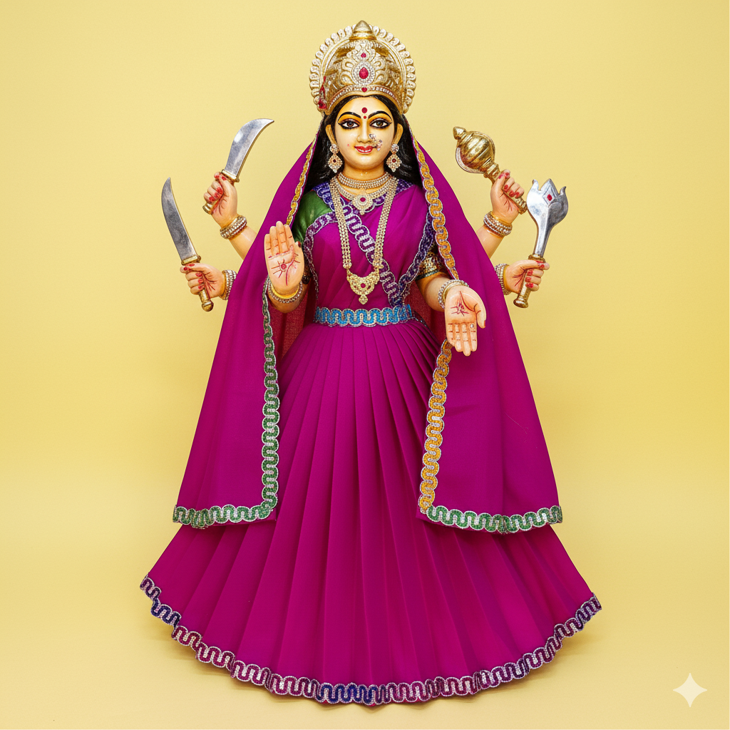 Celebrate the divine energy of Maa Durga with this beautifully handcrafted dress (vastra) designed for your idol or murti. Made from high-quality fabric in a vibrant bright pink color, this dress features elegant pleats and is adorned with a stunning multicolor gota lace border.